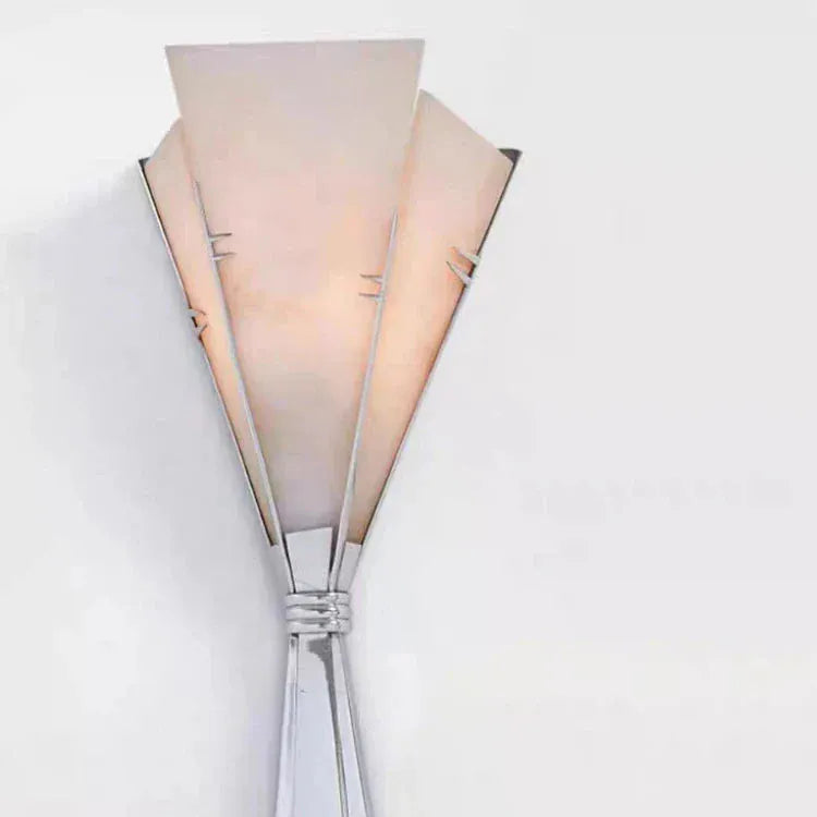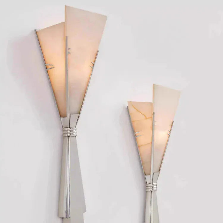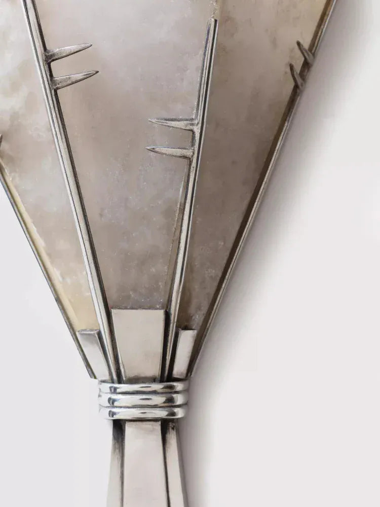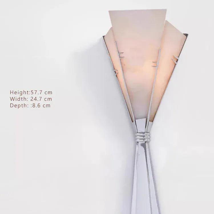 Szkło jest kluczowym materiałem tego kinkietu ściennego. Starannie opracowane, łapie światło i oddaje je z klasą, tworząc delikatne refleksy zmieniające się w zależności od pory dnia. Warstwowa konstrukcja szklanych paneli podkreśla wachlarzowy kształt i nadaje całości niemal rzeźbiarskiej dynamiki. To szlachetna obecność — zauważalna, ale nigdy ostentacyjna.