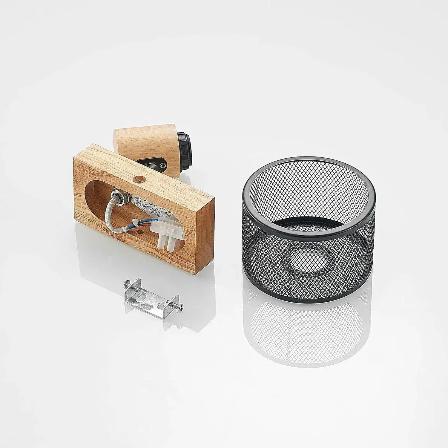 Dobierz żarówkę o ciepłej barwie światła, aby podbić naturalny efekt drewna i złagodzić chłodniejszy charakter metalu. Najlepiej sprawdzą się ściany w odcieniach neutralnych lub lekko ciemniejszych – wtedy metalowa siatka wyraźniej się odcina, a kinkiet staje się elementem dekoracyjnym, nie tylko praktycznym.