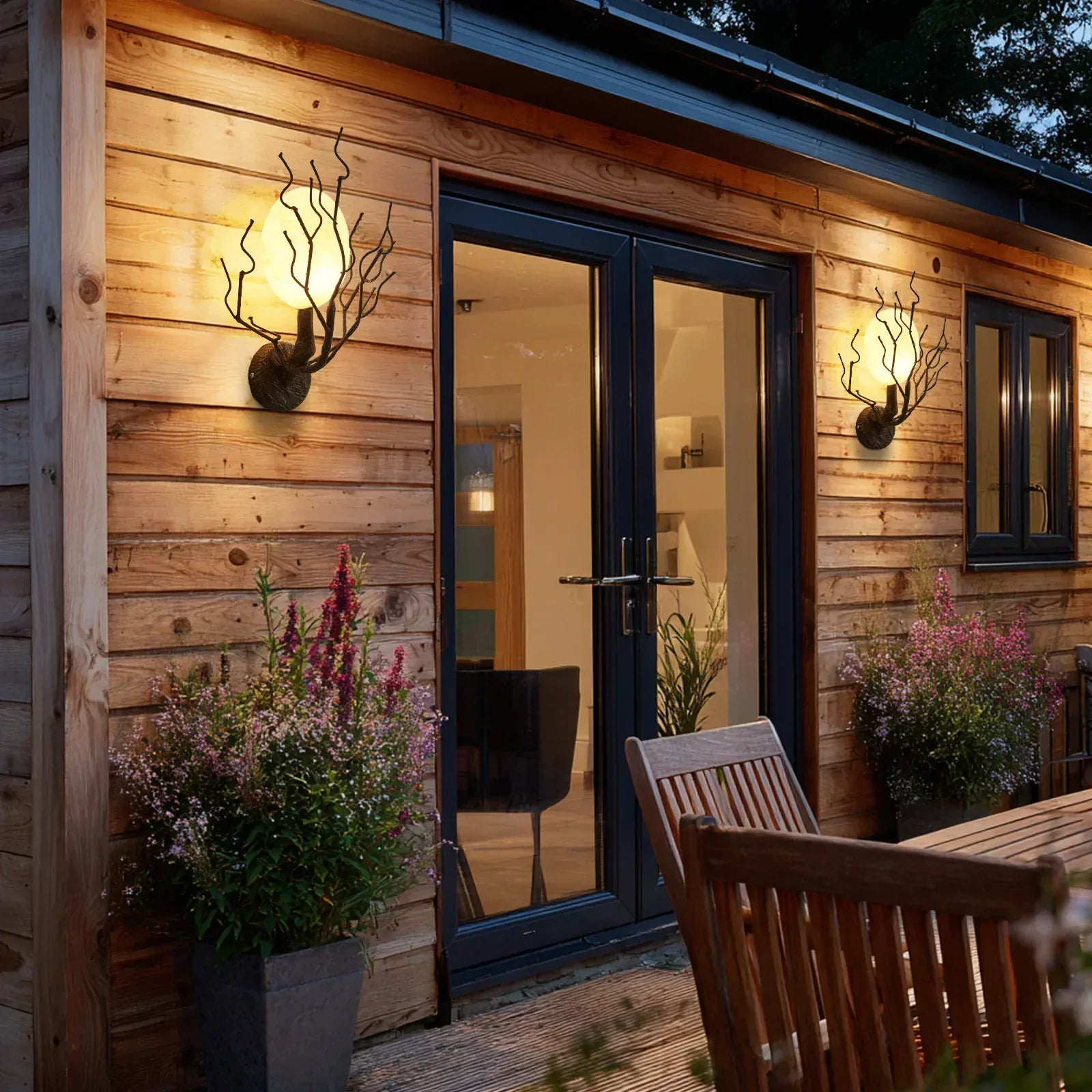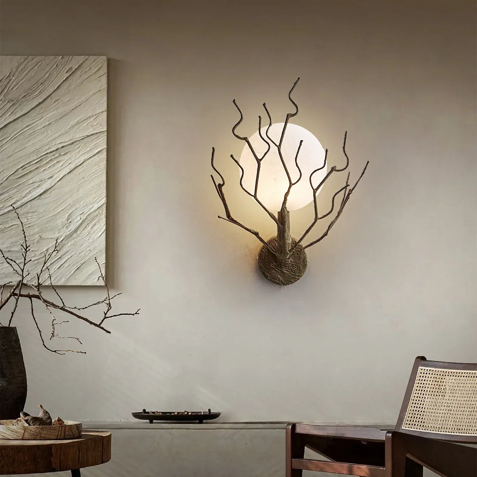 Kinkiet ścienny design – metalowe gałązki i świetlny klosz kula
